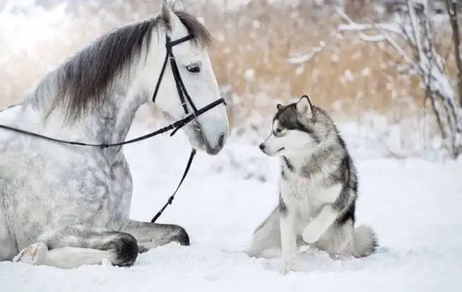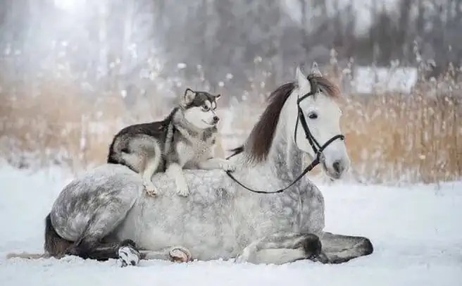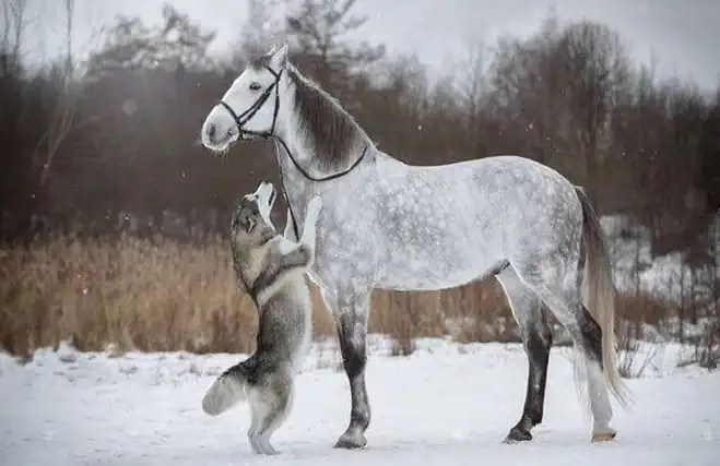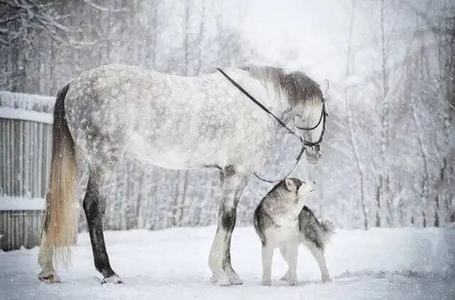Ova galerija predivnih fotografija je djelo Svetlane Pisareve iz Sankt Peterburga u Rusiji, koje prikazuje jedinstvenu vezu između sivog konja i haskija, sa predivnom snježnom pozadinom.